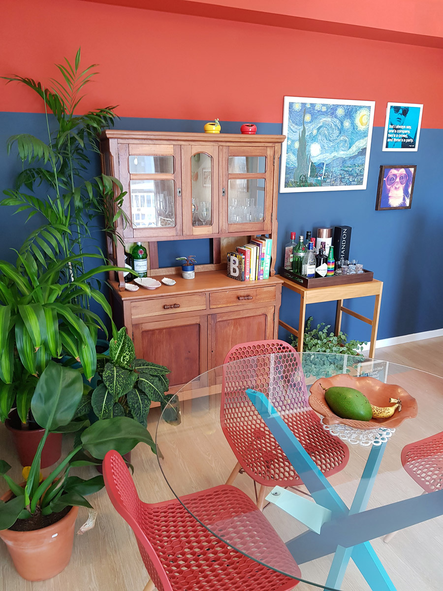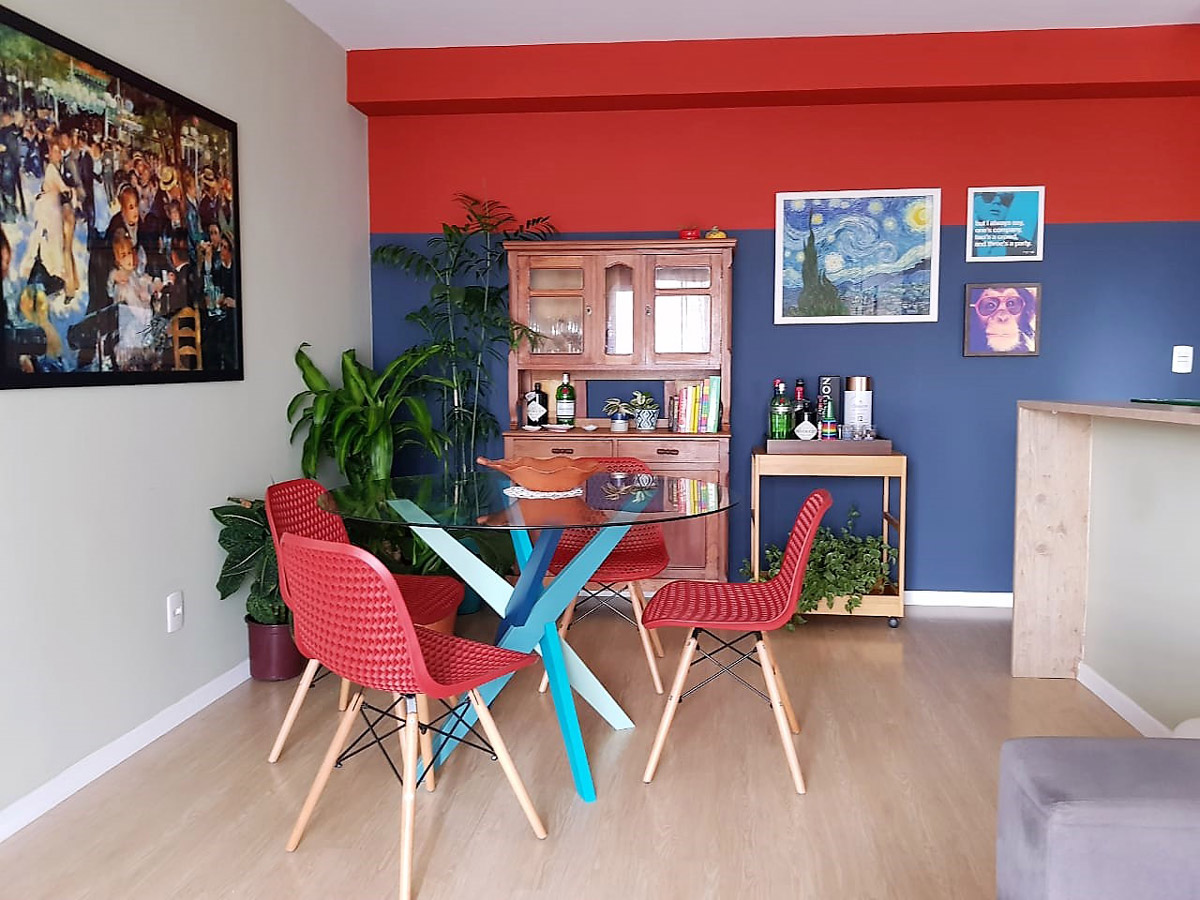 Com tons alegres e vibrantes, esse Living foi transformado rapidamente, usando basicamente tinta colorida e alguns objetos de decoração. A materialidade urbana e mistura de estilos imprimem um ar descolado e alegre ao apartamento do jovem casal.
